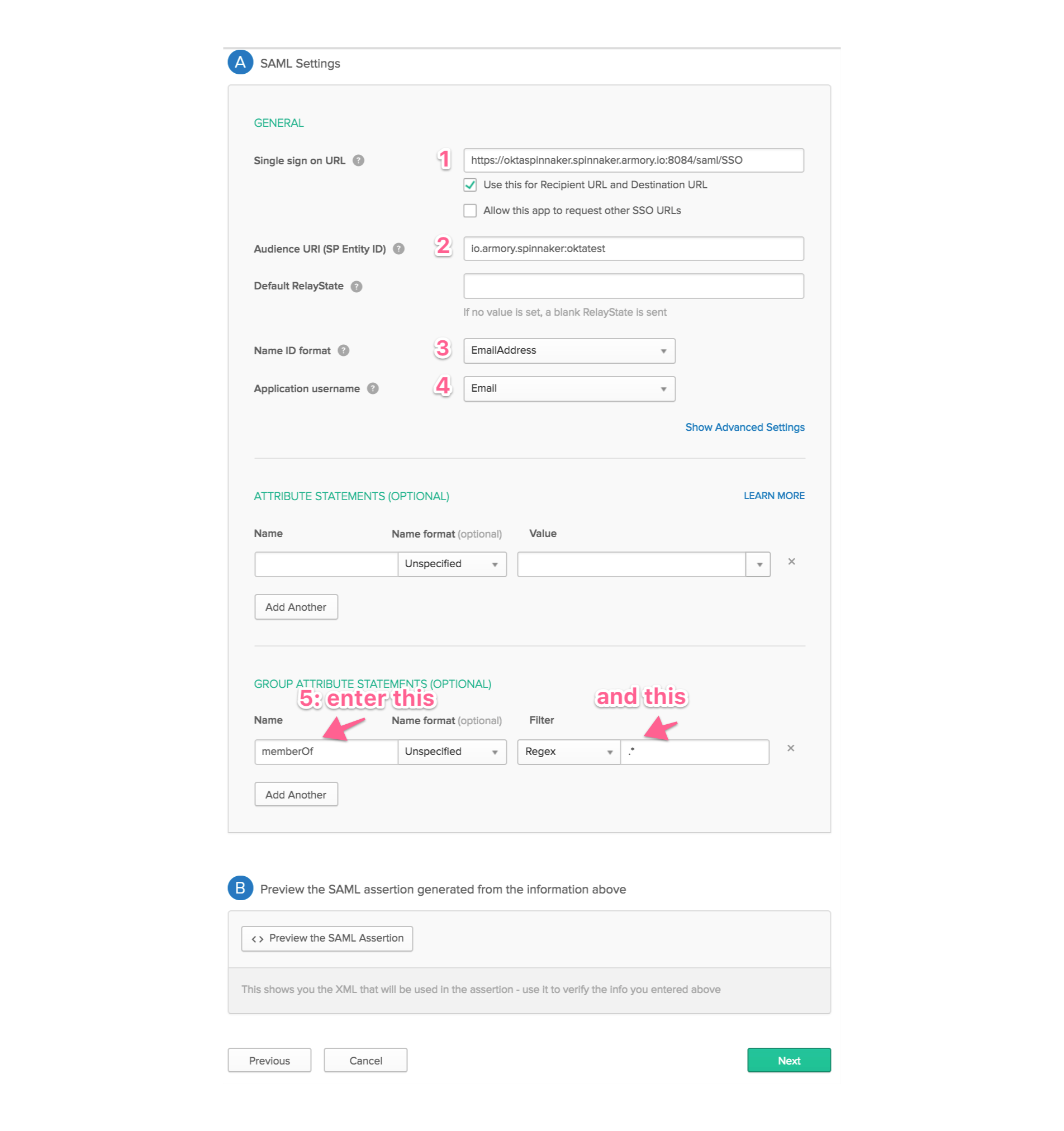 /saml/SSO. For example,https://oktaspinnaker.spinnaker.armory.io:8084/saml/SSOAudience URI (SP Entity ID): Enter a unique entity id. For example,