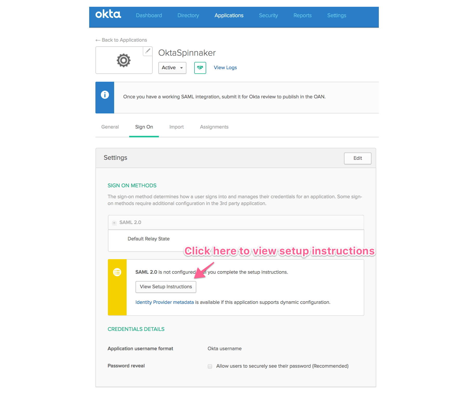 Click the View Setup Instructions button. This displays the page with information necessary to configure Spinnaker.