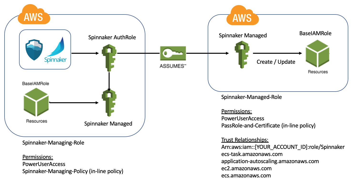 { "Version": "2012-10-17", "Statement": [ { "Effect": "Allow", "Action": [ "ec2:DescribeAvailabilityZones", "ec2:DescribeRegions" ], "Resource": [ "*" ] }, { "Action": "sts:AssumeRole", "Resource": [ "arn:aws:iam::[YOUR_AWS_ACCOUNT_ID]:role/Spinnaker-Managed-Role" ], "Effect": "Allow" } ] }Spinnaker-Managed-Role -> Trust relationship