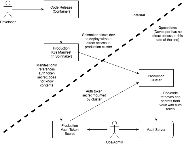 The plan, then, is to use a Kubernetes secret (which the developers should not have access to) to store the Vault auth token (managed solely by an Operations person). The app can use the auth token to retrieve the application secrets from Vault at runtime. Spinnaker acts as a limited-use interface such that the developer can kick off deployments to production, but may not have actual direct access to the credentials for production.