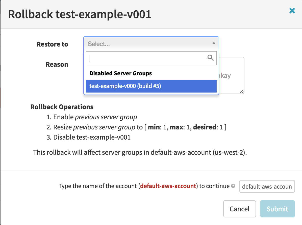In the window that pops up, you can select which server group to rollback to.