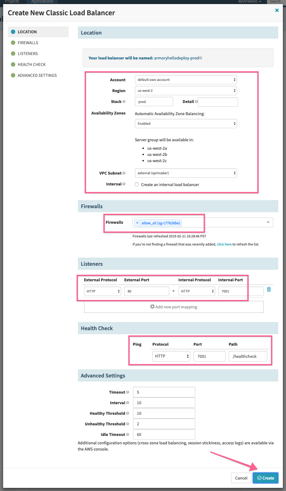 Set the VPC Subnet Type grouping by tagging VPCs so that they appear in the VPC dropdown selection in Spinnaker. This change may take some time to cache and reflect in Spinnaker. In the Firewalls section, select your firewall, which maps to the preconfigured security group. Create the forwarding ports in the Listeners section. Finally, create the Health Check.