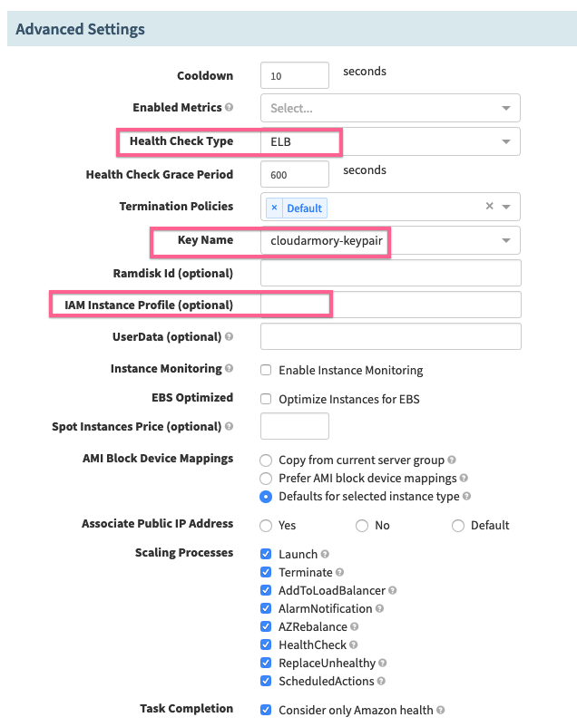 Scroll all the way down to the Advanced Settings section and change the Health Check Type from ‘EC2’ to ‘ELB’, we’ll later see green boxes for health instances, gray for EC2 healthcheck instances, or red for unhealthy instances.