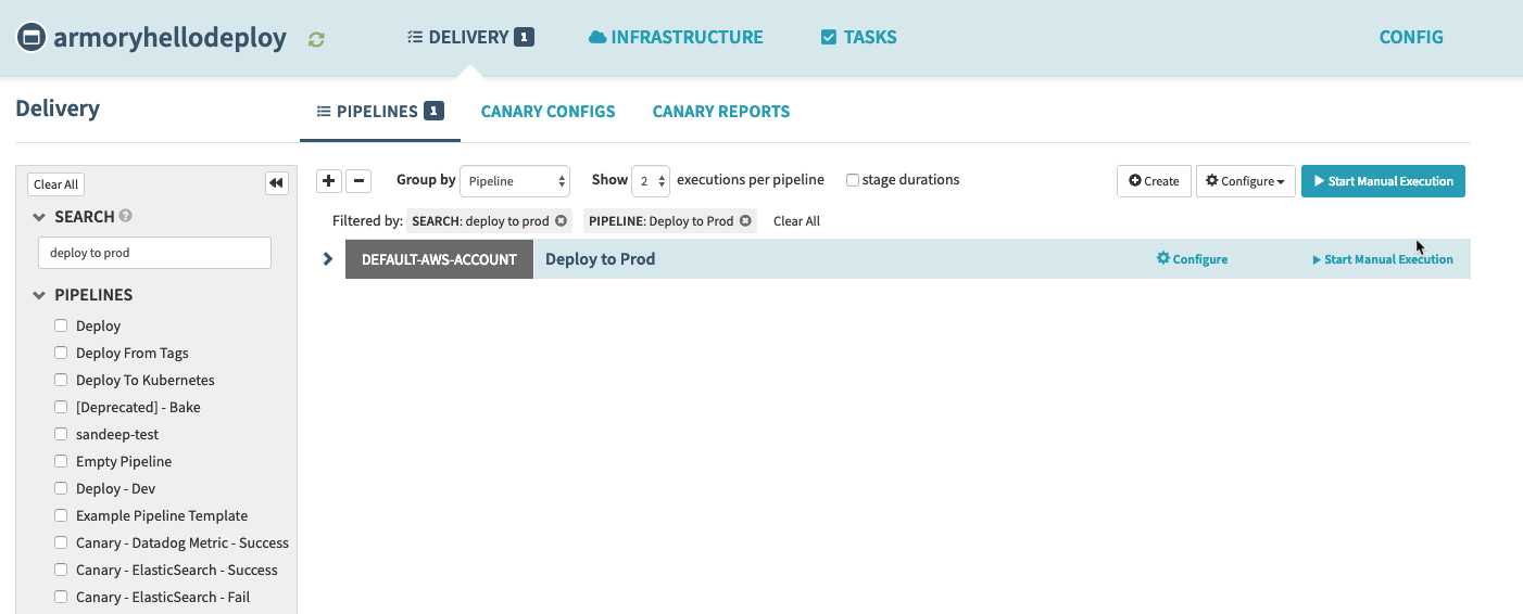 Now, to demonstrate the Blue/Green, go back to the Pipeline Executions screen and press ‘Start Manual Execution’ again. Then go back to the ‘Clusters’ tab to watch the execution process.