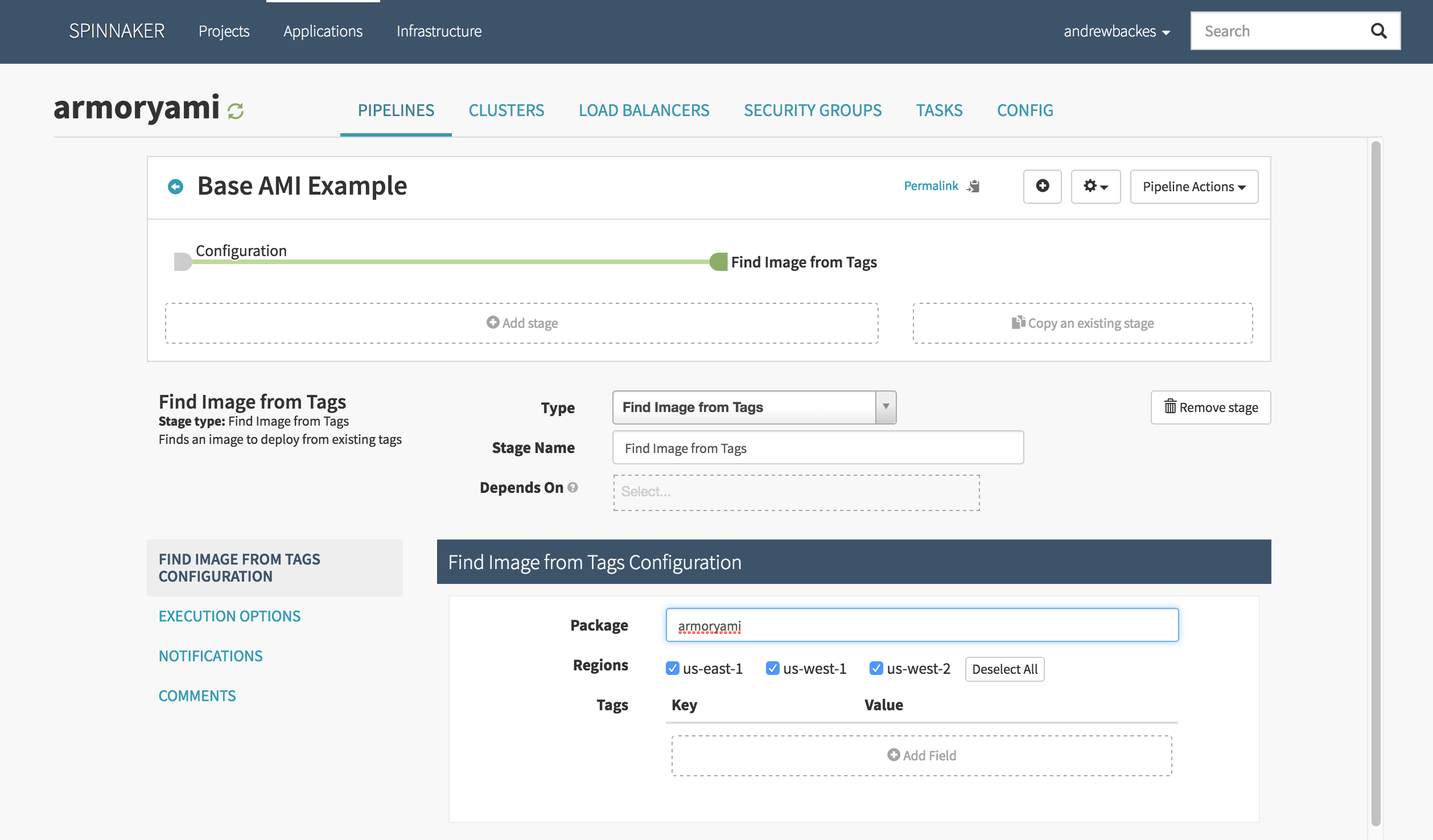 Now I add a ‘Find Images From Tags’ stage and input ‘armoryami’ in the ‘Package’ field. The ‘package’ you input needs to match the package installed by the baked AMI in the prior bake pipeline.