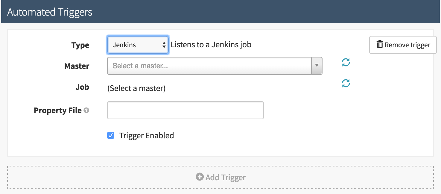 To add a Jenkins trigger to your pipeline, go to your configurations stage and select “add trigger”, then select “Jenkins” from the Type dropdown menu. Select a Master from the Master category list and then select a Job to trigger from the pipeline.