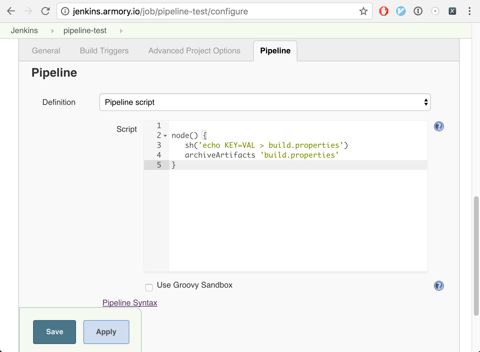 First we navigate to my Jenkins Master and create a new Jenkins 2.0 Pipeline Job. As you can see in the image below, this job creates and archives a file named build.properties which contains the key value pair KEY=VAL.