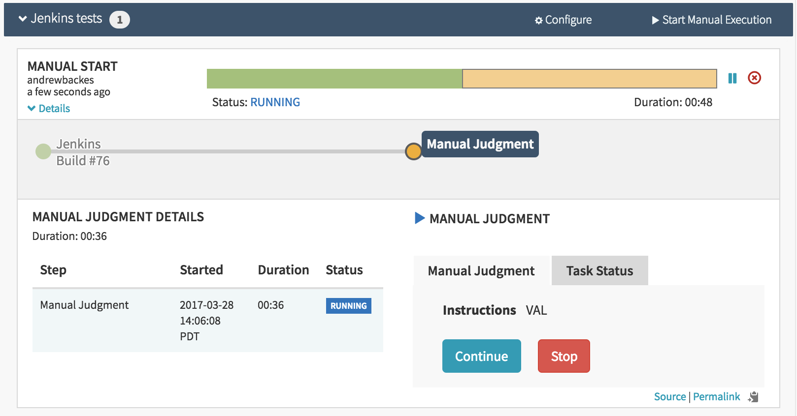 In this example, we will create a pipeline with a Jenkin’s job stage and a manual judgement that repeats back the value of a property in a properties file from the Jenkins’ job.