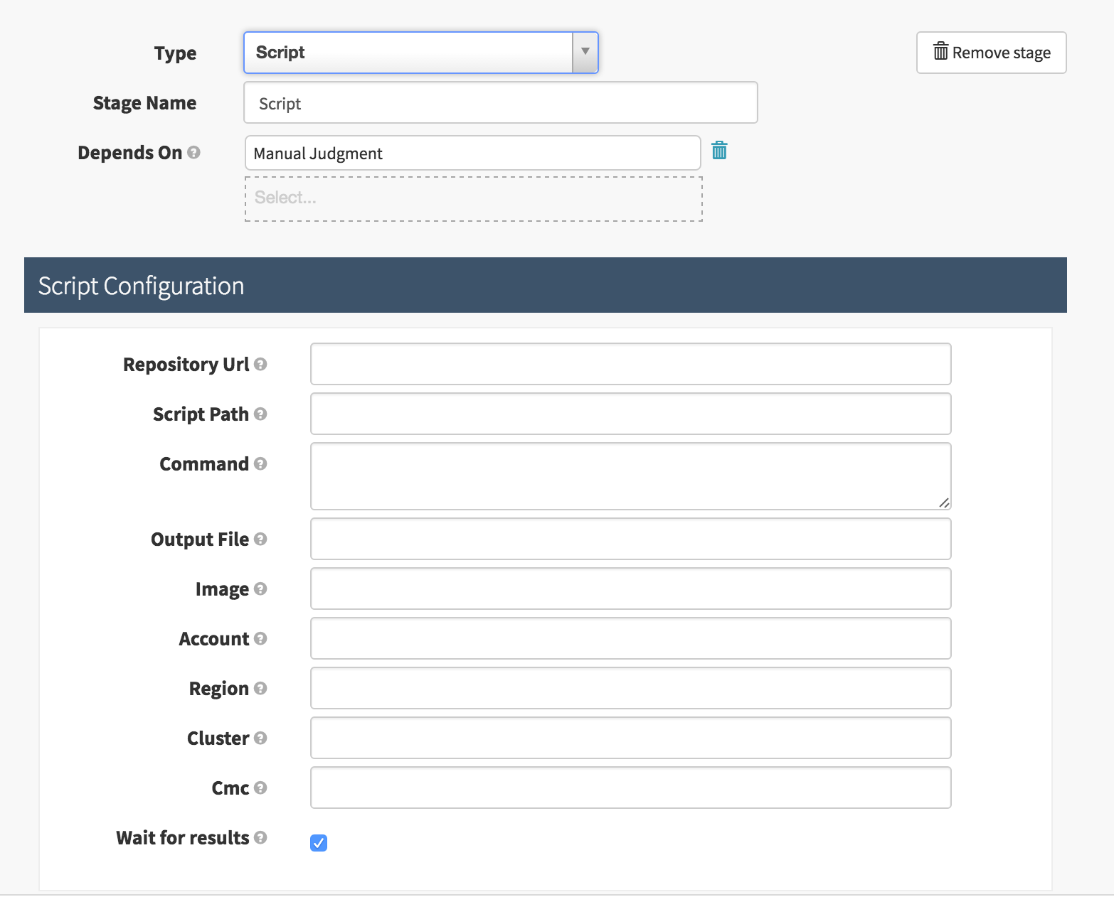 You can also run arbitrary scripts on Spinnaker (behind the scenes it is pushing this work off to a Jenkins master). Simply select the Script type stage while configuring a pipeline. You should see a screen like: